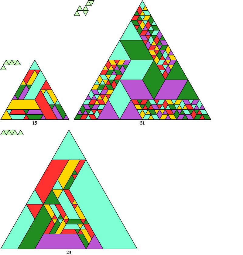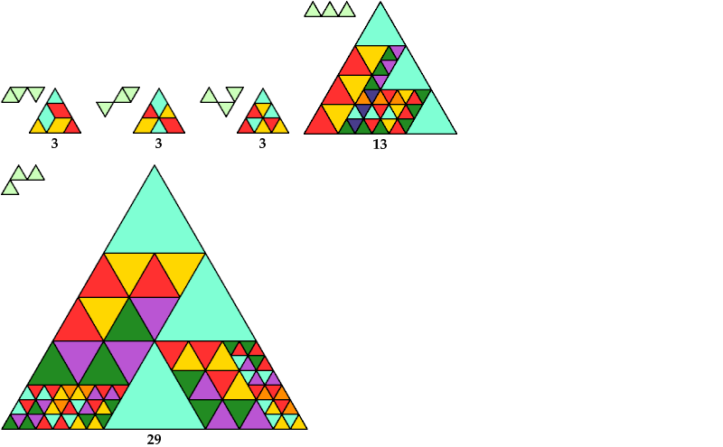 Here I show known tilings of a triangle by scaled polymings that use the fewest tiles. If you find a solution with fewer tiles, or solve an unsolved polyming, please write.