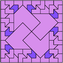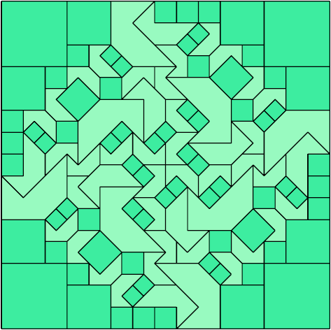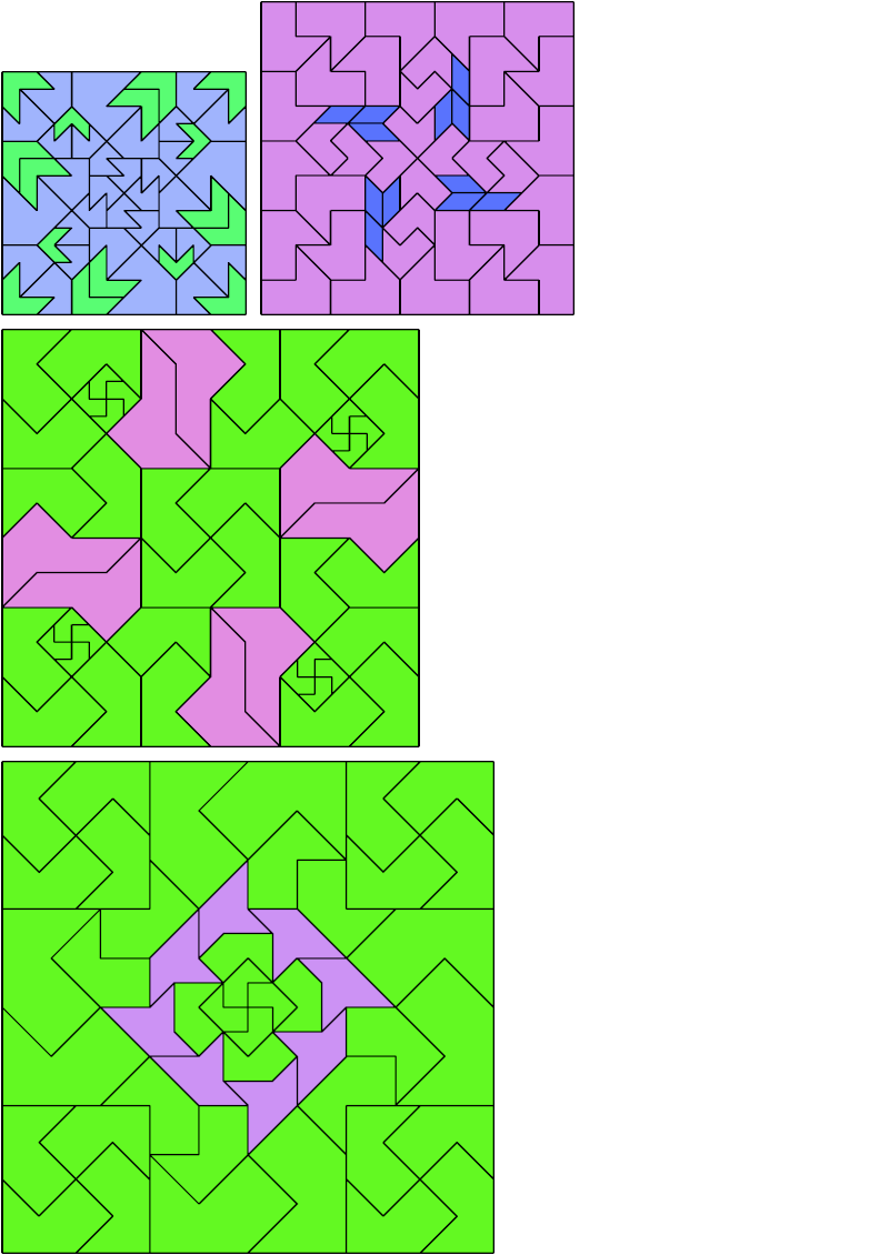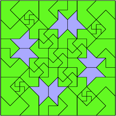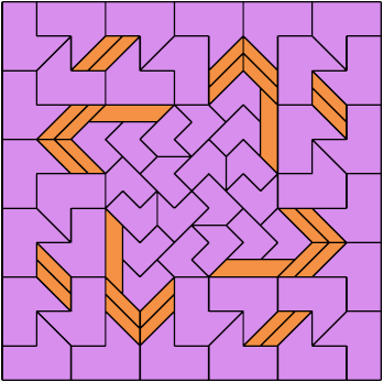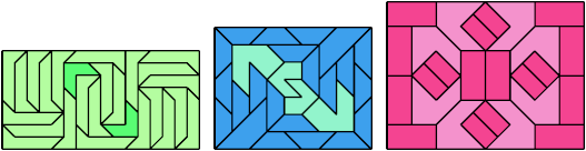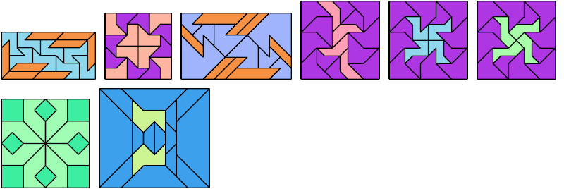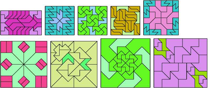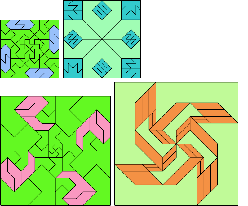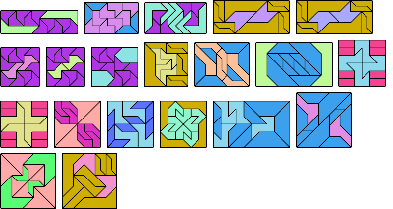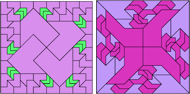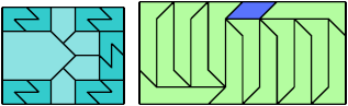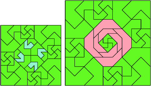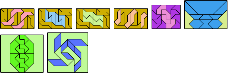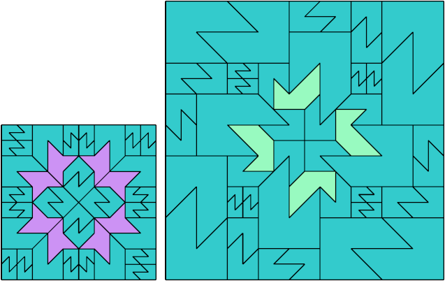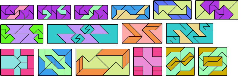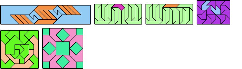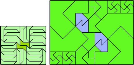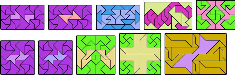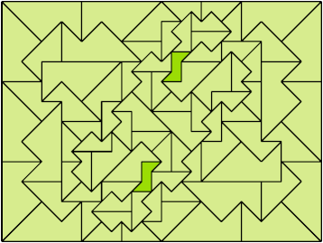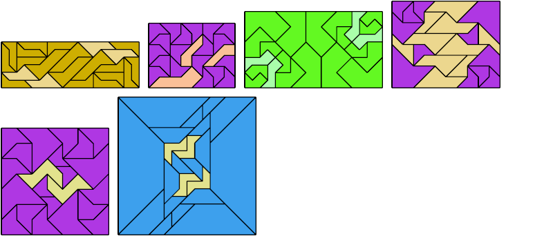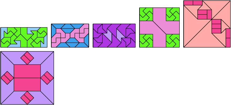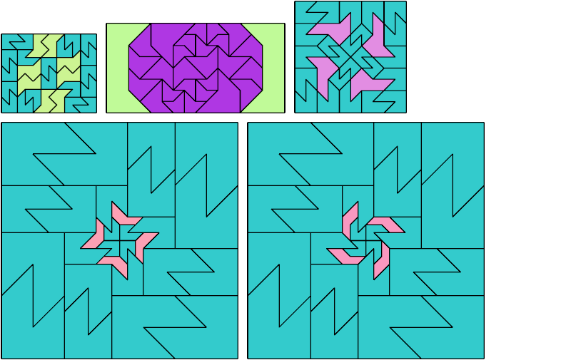 Here I show a rectangle tiled by a scaled tetrabolo and a scaled pentabolo, using at least one copy of each and as few total copies as is known to be possible. If you find a solution with fewer tiles or solve an unsolved case, please write.