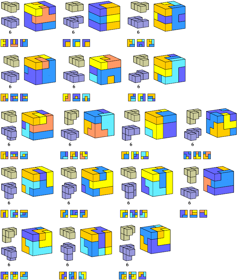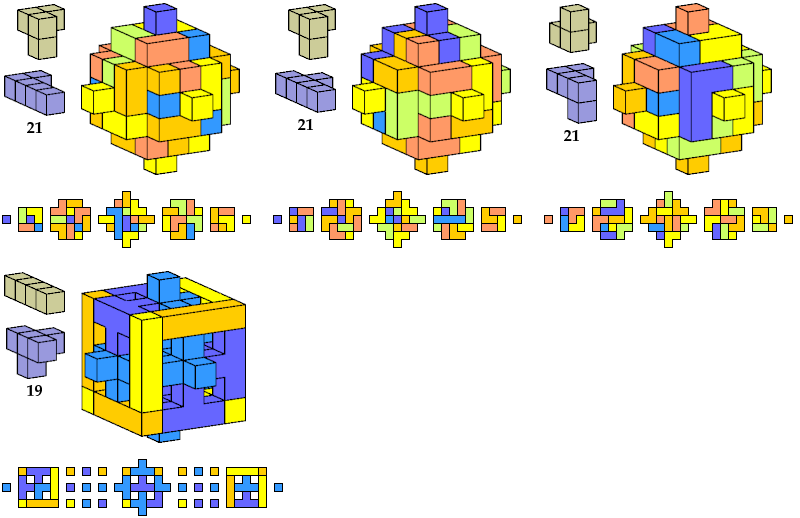 A pentacube is a solid made of 5 equal cubes joined face to face. There are 29 pentacubes, counting distinct mirror images.