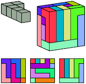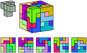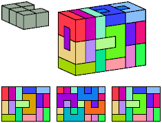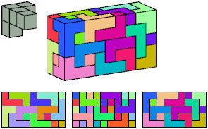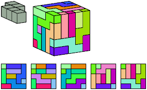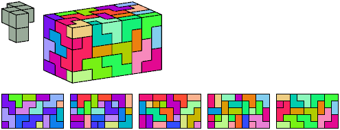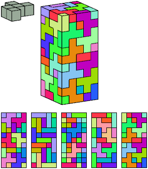 Can a rectangular prism, or box, with odd volume, be filled with copies of a pentacube? For each pentacube, here is the smallest known odd box that it can fill. Torsten Sillke's polycube box tiling page identifies many boxes besides the smallest that can be tiled by polycubes. Toshihiro Shirakawa's Box Packing Collection has extensive box tiling data for polycubes, edge-polycubes, and polyhypercubes.