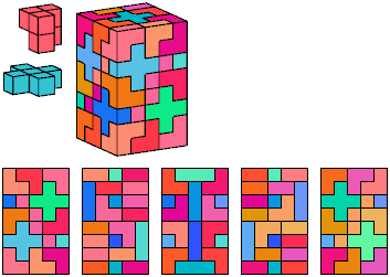 All but two of the pentacubes, G and X, can tile a rectangular prism, or box. All but one pair of pentacubes, G-G′, can jointly tile a box.