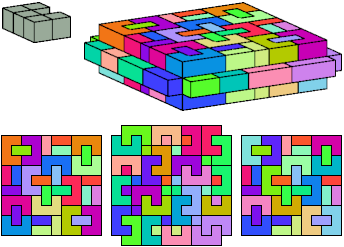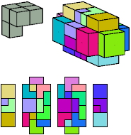 All but two pentacubes can tile a rectangular prism, or box; see Pentacubes in a Box. Here I show, for each pentacube, a minimal known box from which the cells along all edges have been removed, tiled by that pentacube. The cross-sections are shown from top to bottom. If you find a smaller solution for a pentacube, or solve an unsolved case, please write.