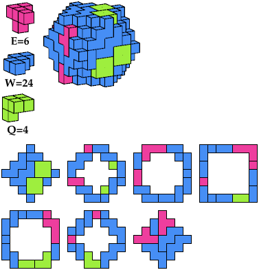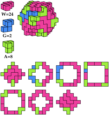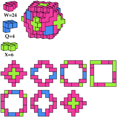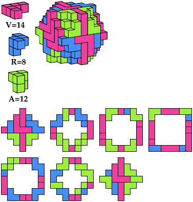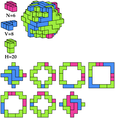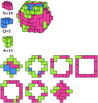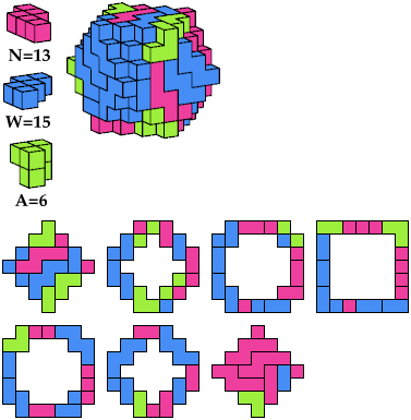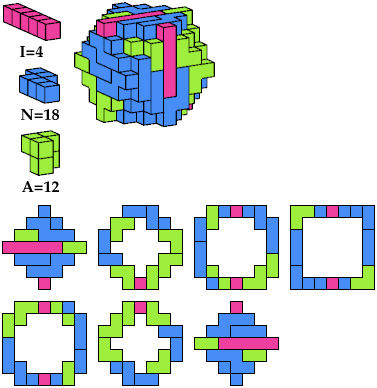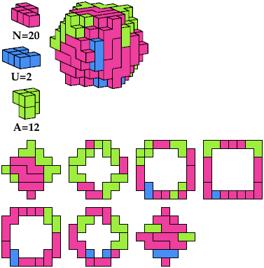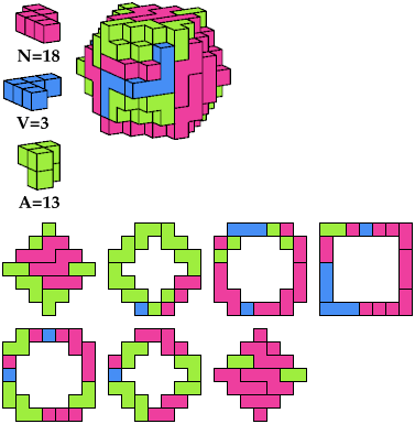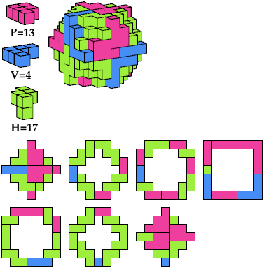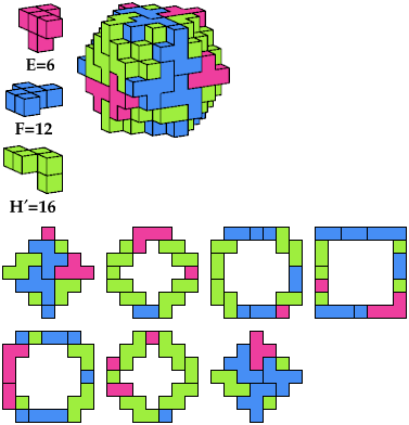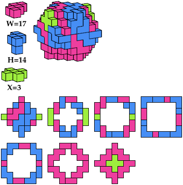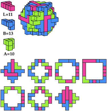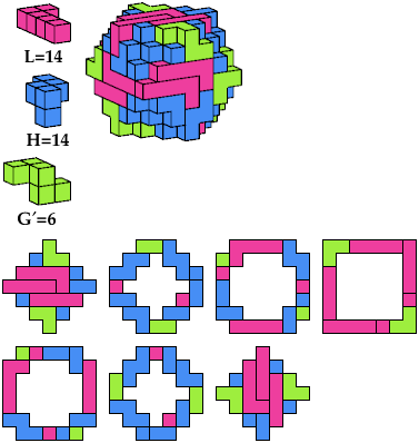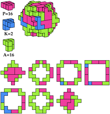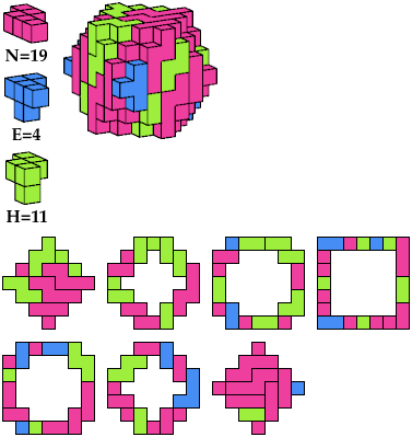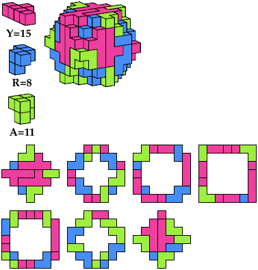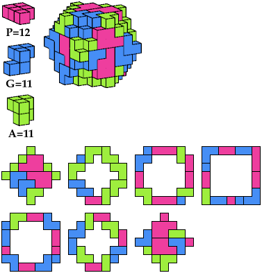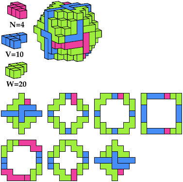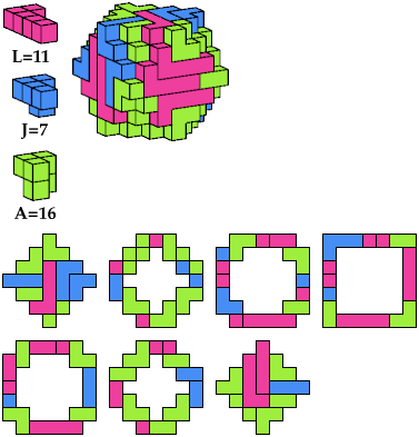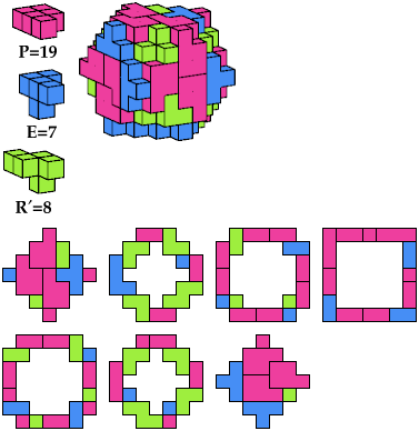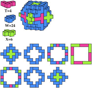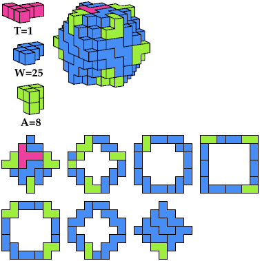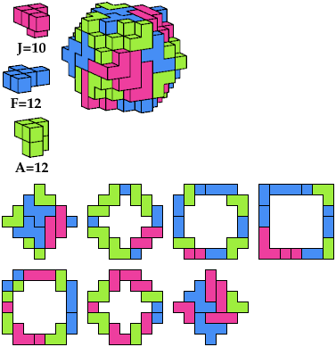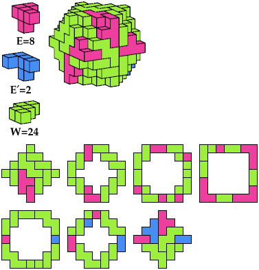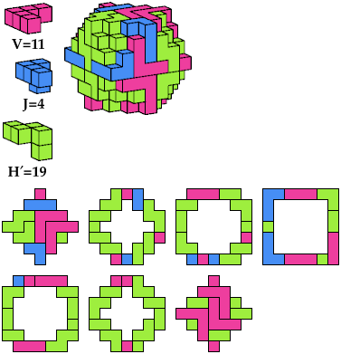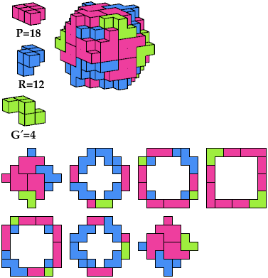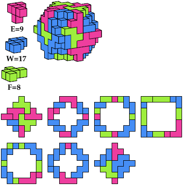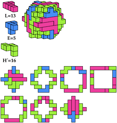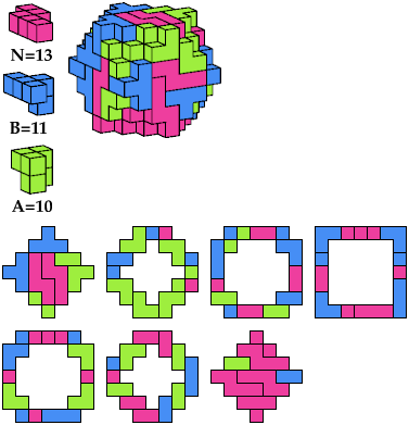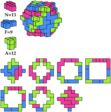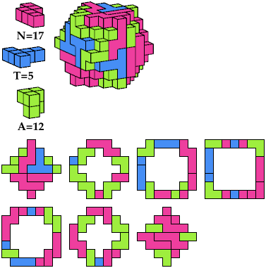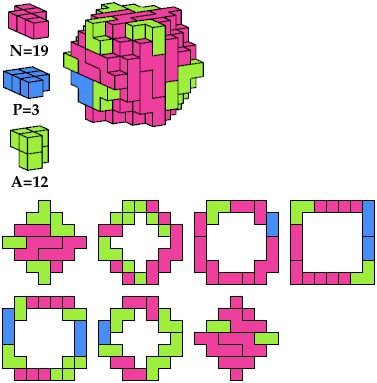 Many sets of three pentacubes can tile this shell. To view a tiling, click on @ in the table below.