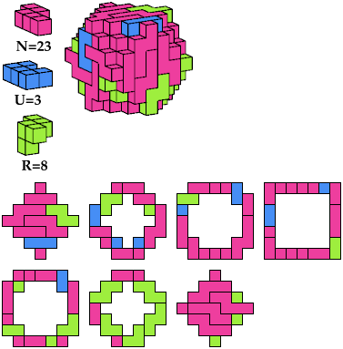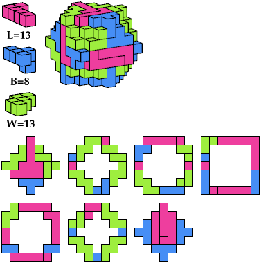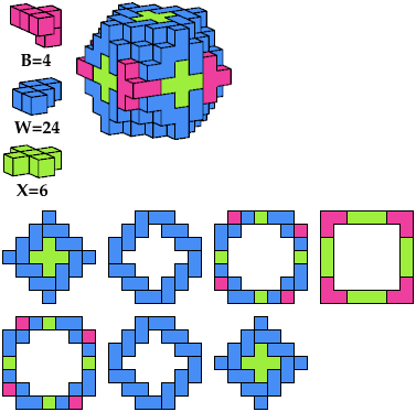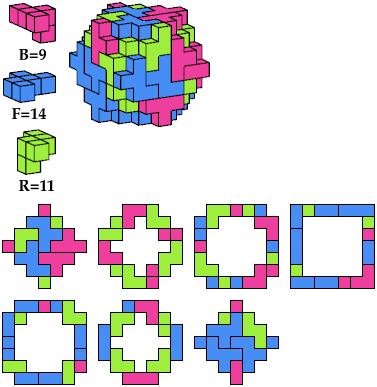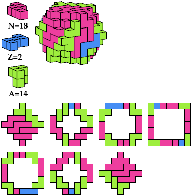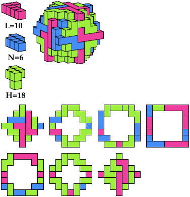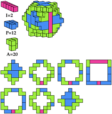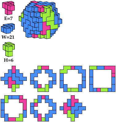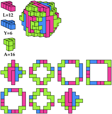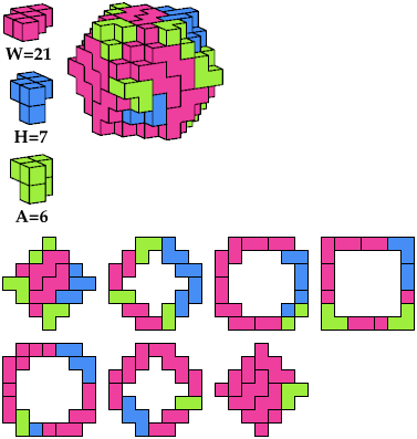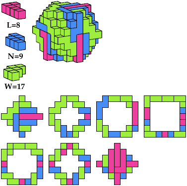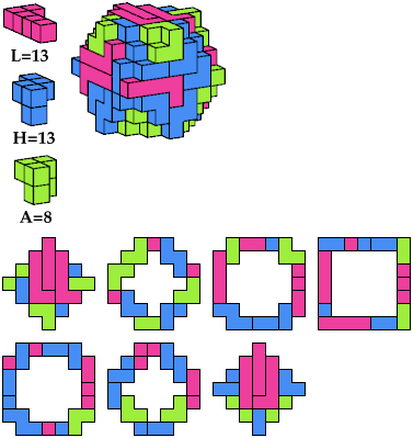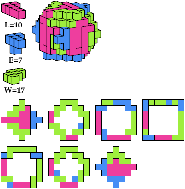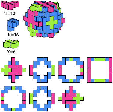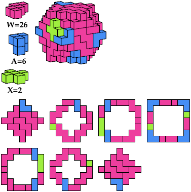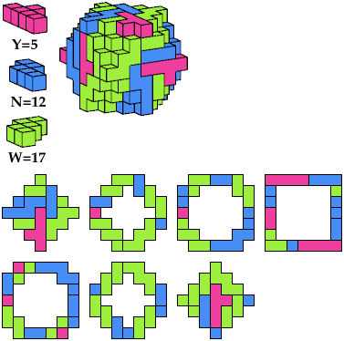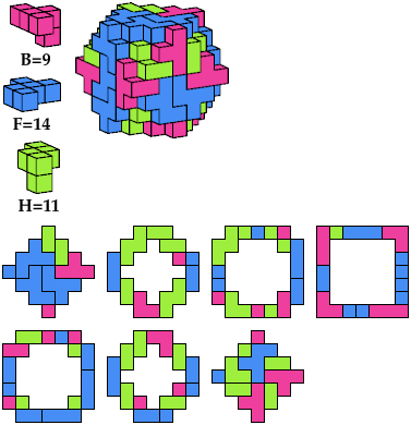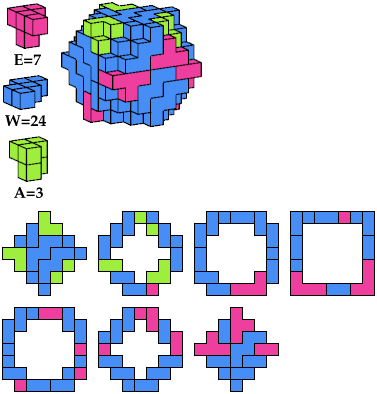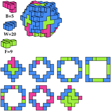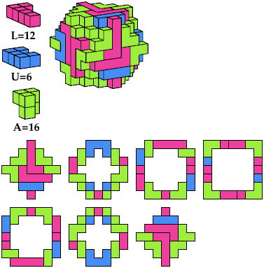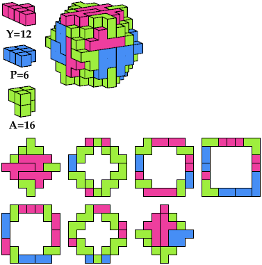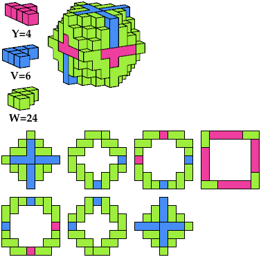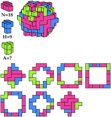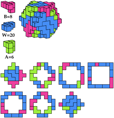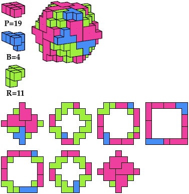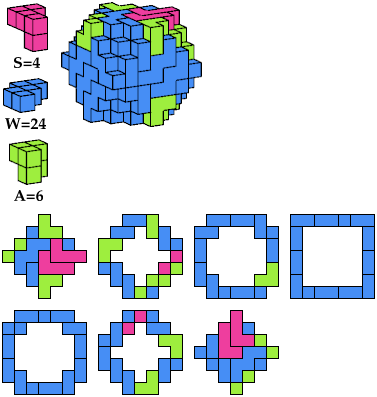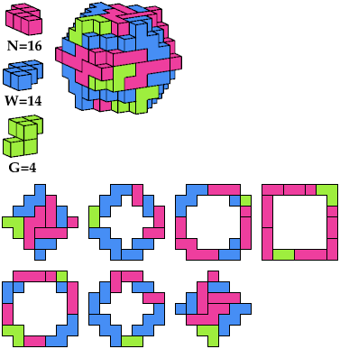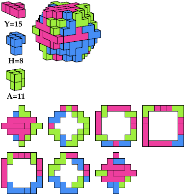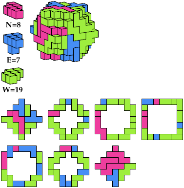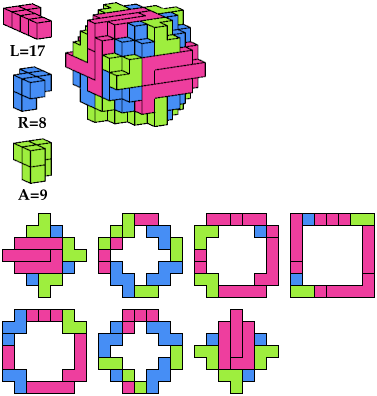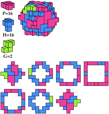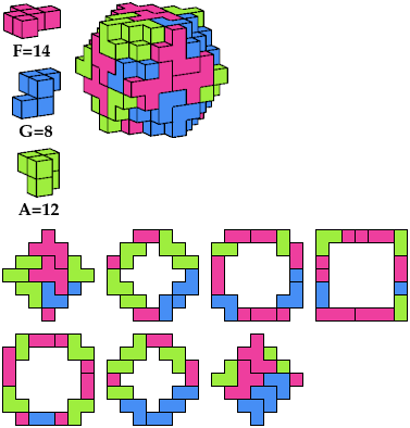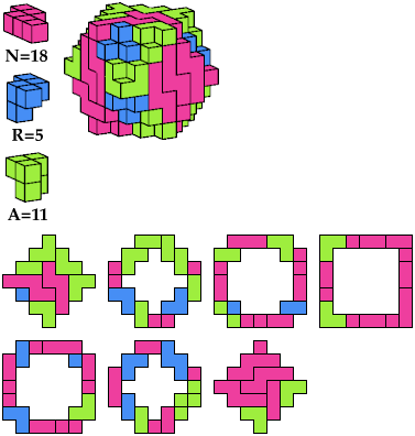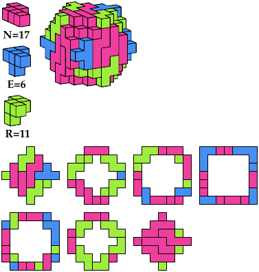 Many sets of three pentacubes can tile this shell. To view a tiling, click on @ in the table below.