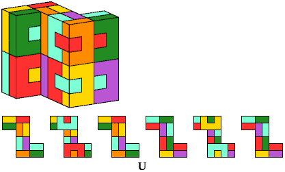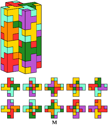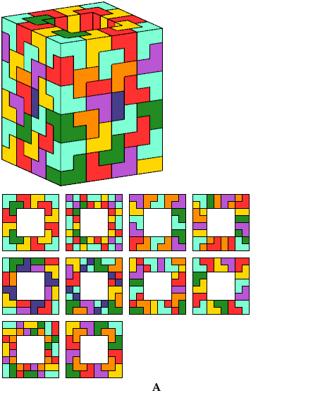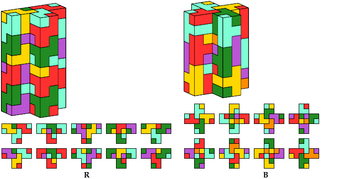 The solution shown for pentacube W is a rectangular box tiling. Smaller solutions may exist.
