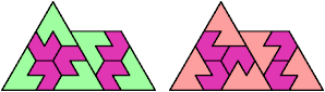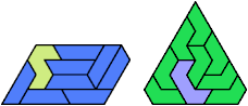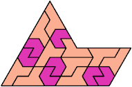 Here I show the smallest known pentagonal (five-sided) polyiamonds that can be formed by copies of a pentiamond and a heptiamond, using at least one of each. If you find a smaller solution, please write.