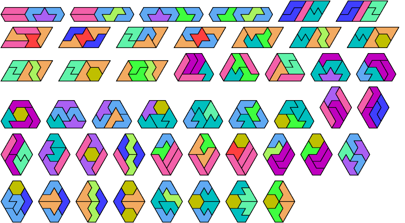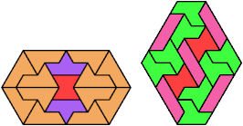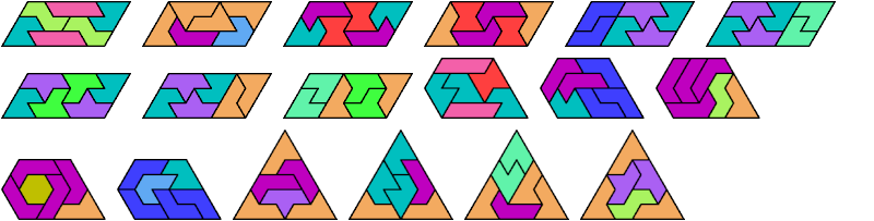 Here I show the smallest known convex shapes that can be formed with each set of three hexiamonds, using at least one of each.