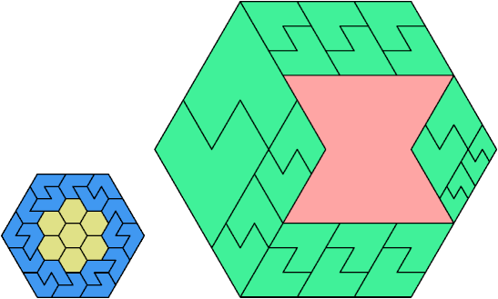 Here I show the fewest copies of two scalable hexiamonds that can tile some regular hexagon. If you find a smaller solution or solve an unsolved case, please write.