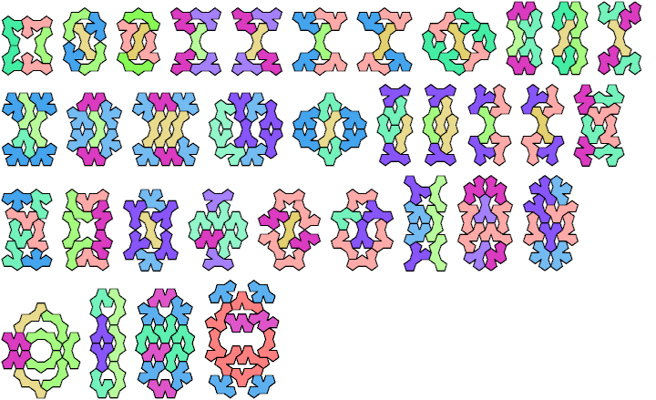 Oddities can also be constructed from sets of different shapes. Here are the minimal known oddities for triplets of tetrapents, using at least one copy of each tetrapent. Please write if you find a smaller solution or solve an unsolved case.