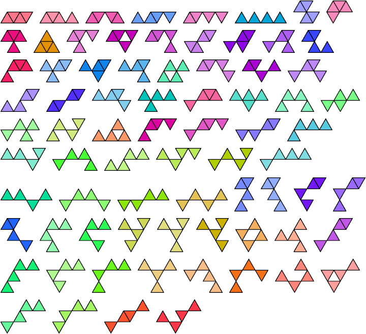 Two-sided polymings are identified under reflection as well as rotation. One-sided polymings are distinguished under reflection. That is, if a polyming and its mirror image are distinct, both are counted.