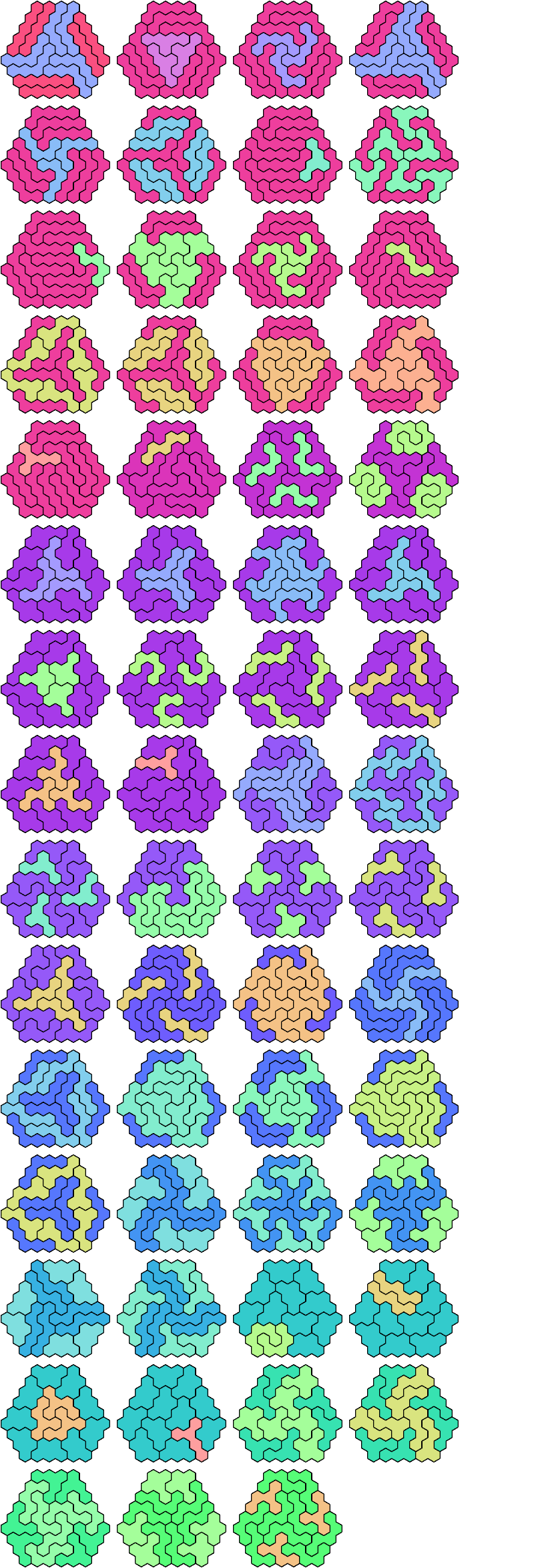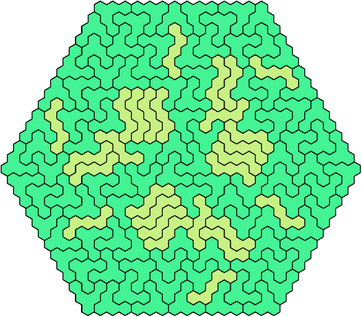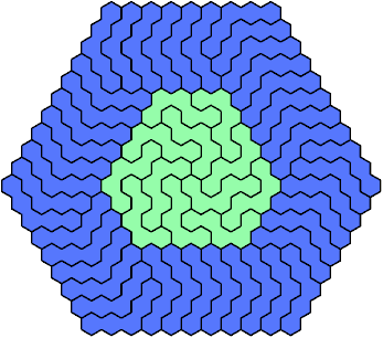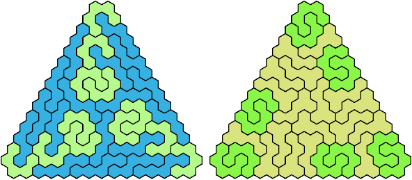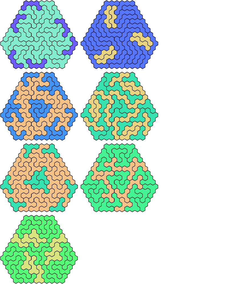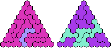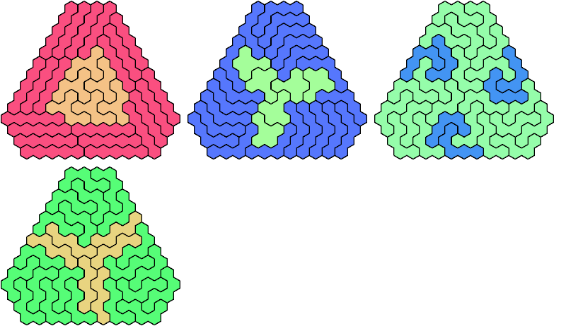 A triangular polyhex is an extreme form of a badge. Many of the solutions below are triangular. See the bottom of the page for non-triangular variants.