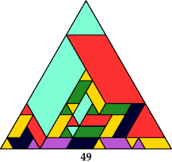 Here I show known tilings of a triangle by scaled polymings that use the fewest tiles. If you find a solution with fewer tiles, or solve an unsolved polyming, please write.