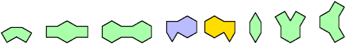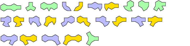 The figures below show one-sided polybirds. Mirror pairs appear in blue and yellow. Achiral polybirds appear in green.