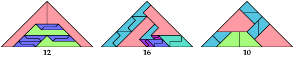 The tilings shown use as few tiles as I know how, and are not necessarily unique under this condition. If you find a tiling with fewer tiles, please write.