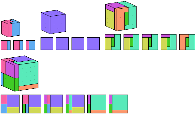 It is not known how many of the pieces in an 8-piece dissection can be rectangular prisms. However, T. H. O'Beirne found a dissection with 9 pieces, all rectangular prisms. See Martin Gardner's Knotted Doughnuts and Other Mathematical Entertainments (1986).