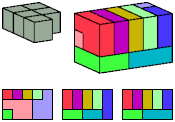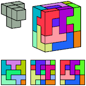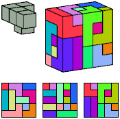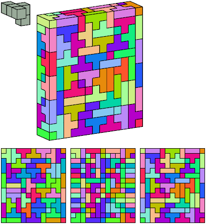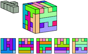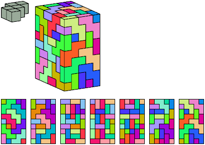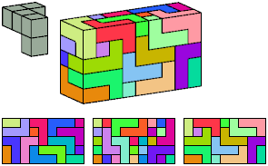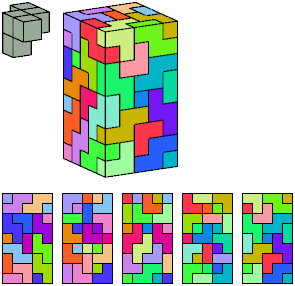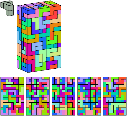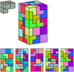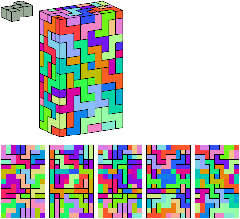 Can a rectangular prism, or box, with odd volume, be filled with copies of a pentacube? For each pentacube, here is the smallest known odd box that it can fill. Torsten Sillke's polycube box tiling page identifies many boxes besides the smallest that can be tiled by polycubes. Toshihiro Shirakawa's Box Packing Collection has extensive box tiling data for polycubes, edge-polycubes, and polyhypercubes.