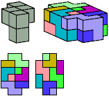 All but two pentacubes can tile a rectangular prism, or box; see Pentacubes in a Box. Here I show that every pentacube can tile a box from which the cells along four parallel edges have been removed. Dimensions are given with the height last. The cross-sections are shown from top to bottom. If you find a smaller solution for a pentacube, please write.
