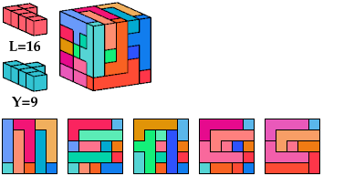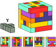 Here I show which pairs of pentacubes can tile the a 5×5×5 cube, using at least one copy of each pentacube. A prime mark (′) after a letter denotes a mirror image. For example, S′ is the mirror image of S. To see a tiling, click on the corresponding entry in the table below. Missing entries indicate unsolved cases. Yellow cells indicate that the tiling is unique.