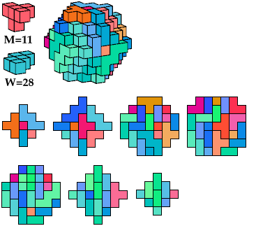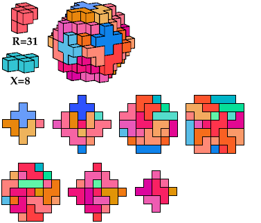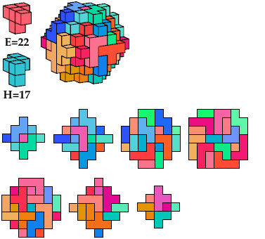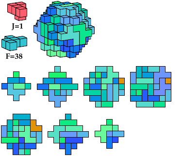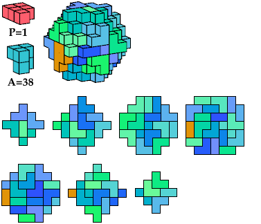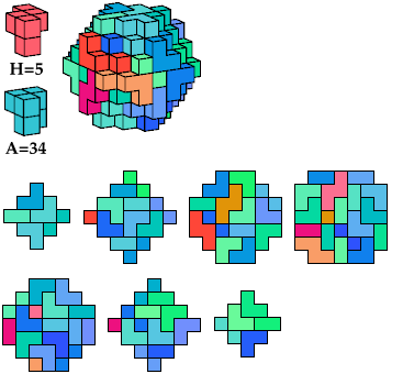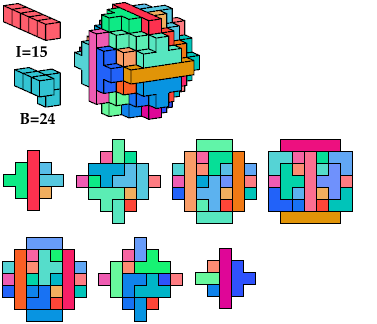 I call such cuboctal polycubes heavy, and cuboctal polycubes such as the green one above light. Heavy cuboctal polycubes must be fairly large to have their number of cells be divisible by 5. The smallest such polycube has 720 cells. The red polycube shown above has 93 cells.