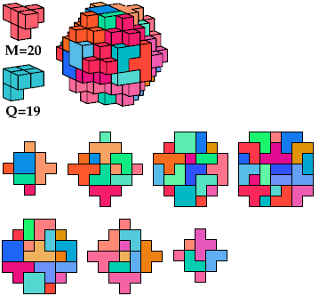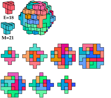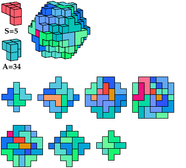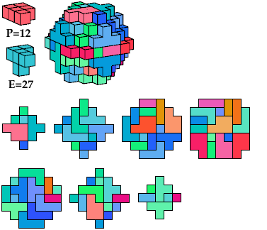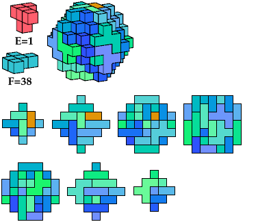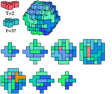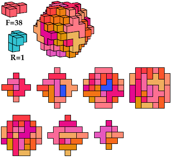 The A and F pentacubes can each tile this polycube alone. To see such tilings, click on the corresponding index link in the table. This polycube is the smallest known full-symmetry oddity for the A and F pentacubes.