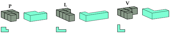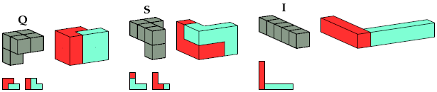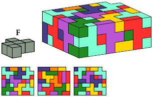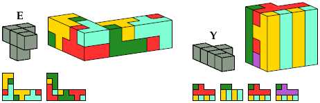 The solutions shown for pentacubes I, E, and B are formed by joining two rectangular box tilings. No smaller solutions exist for these pentacubes.
