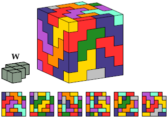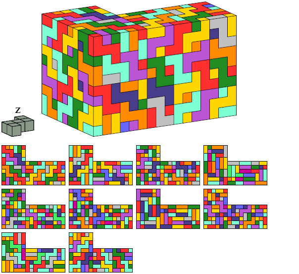 Each of the solutions shown for pentacubes T, R, A, Z, and M are formed by joining two rectangular box tilings. Smaller solutions may exist for these pentacubes.