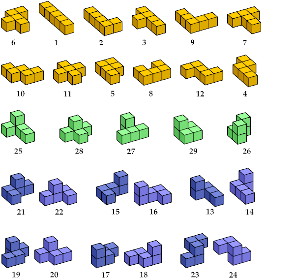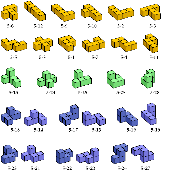 Here are the 29 pentacubes. The flat pentacubes appear first, then the nonflat pentacubes with mirror symmetry, then the six mirror pairs.