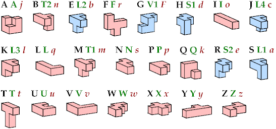 Six pentacubes are not shown. They are the mirror images of the chiral pentacubes, which are shown in blue.