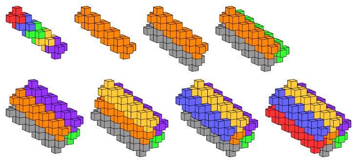 The first figure shows pansymmetric heptacubes joined to form an infinite straight diagonal row. The remaining figures show how six of these rows can surround a seventh row, the orange row. Repeating this process for every row will fill space with copies of the pansymmetric heptacube.