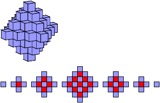 For what other values of n can the solid diamond of order n be tiled with right tricubes? Andy Liu has shown by algebra that the number of cells in a solid diamond of order n is a multiple of 3 if and only if n is congruent to 4, 5, or 6 (mod 9). To show that the solid diamond of order 4 cannot be tiled with right tricubes, color its 63 cells alternately blue and red: