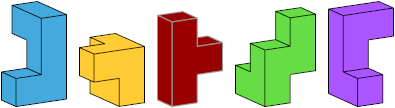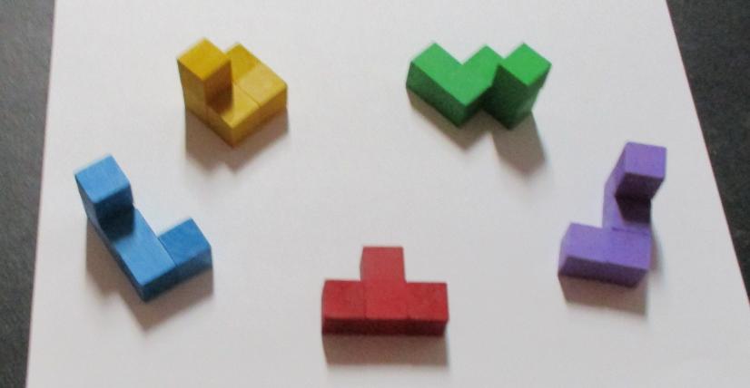 Place the pieces on a flat surface and hide the T-shaped piece under the other four.