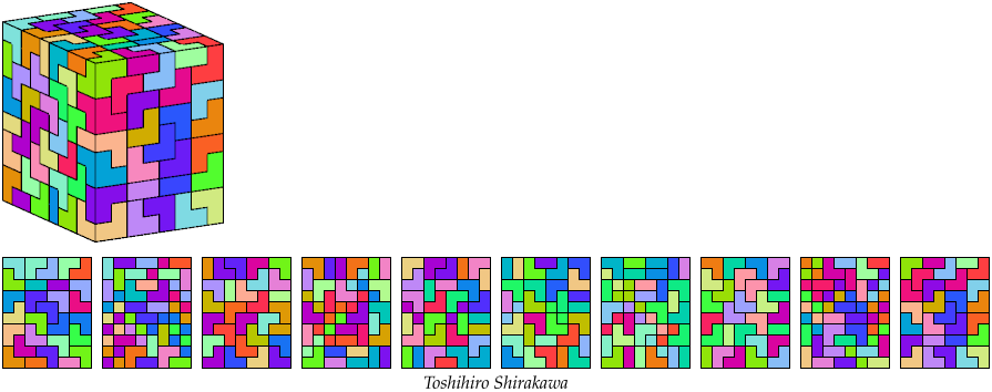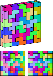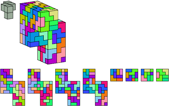 For the smallest box tilings of the other pentacubes, see Pentacubes in a Box. On this page I show only the smallest known rep-tiling for each polycube. If the rep-tiling is assembled from big cubes, I give only a description of the tiling. It would be interesting to know all possible rep-tiling values for each polycube.