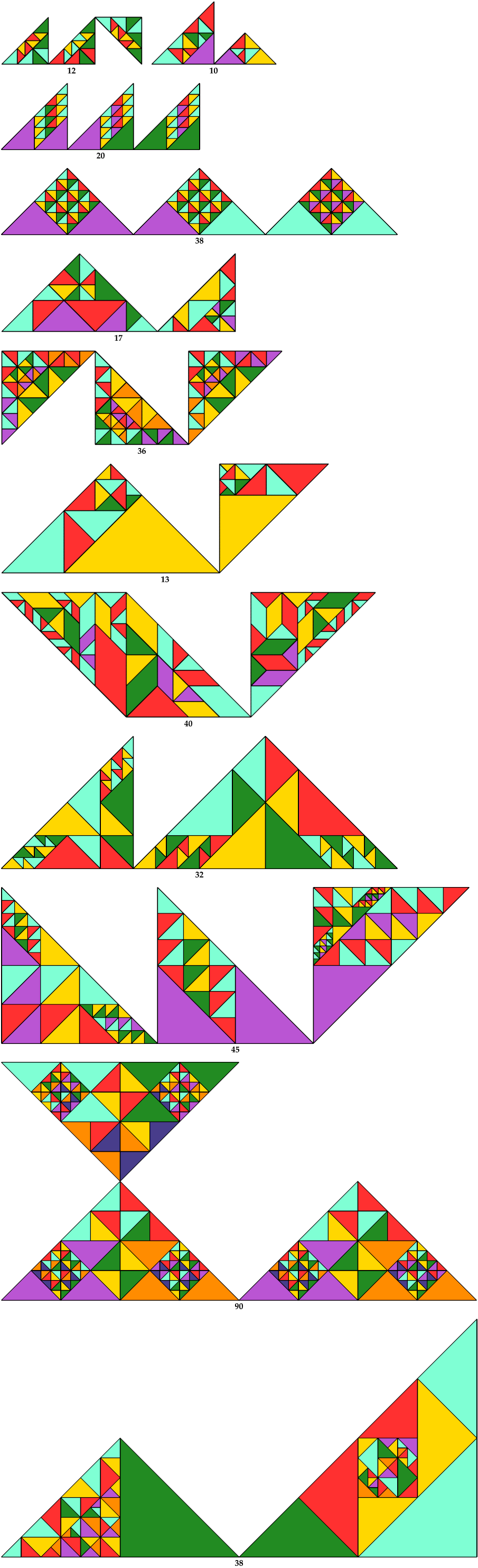 Here I present minimal known irreptilings for proper polyfetts—those that are not also polyaboloes. Polyfetts with the same shapes as smaller polyfetts are omitted. Proper reptilings are shown in shades of blue.