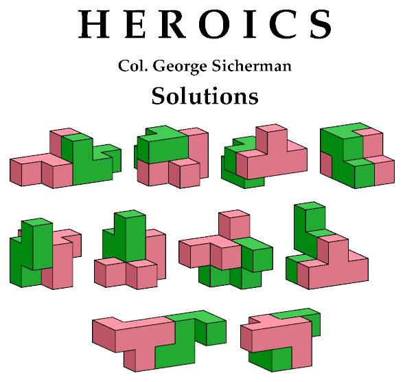 Heroics was inspired by Edi Nagata's puzzle Two PentaCube Symmetry. Frederic Boucher discovered the rotary symmetries.