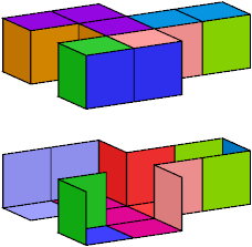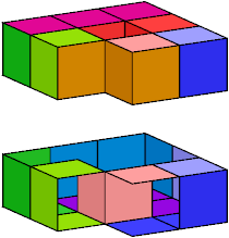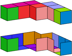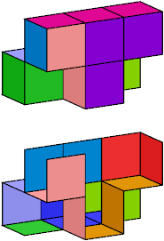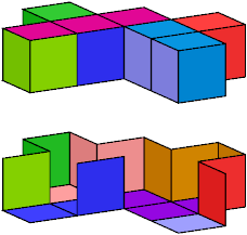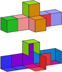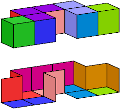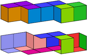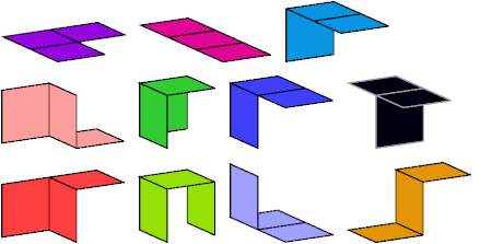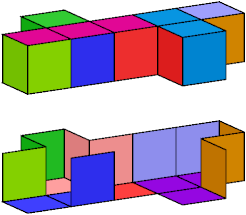 A set of polyominoids is said to wrap a polycube if it tiles the polycube's surface. The black trominoid shown above has three cells incident at a common edge. It can be used in wrapping only rare polycubes, such as the A pentacube: