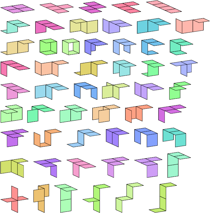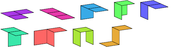 Polyominoids may be generalized to other dimensions. An (n,k)-polyominoid is a set of k-dimensional cells in the n-dimensional grid, connected at (k−1)-dimensional cells. Examples: