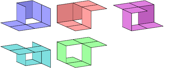 A Möbius Band is a band with only one face. Such a band contains the equivalent of a half-twist, along with any number of whole twists. Thus, either face of any cell can be traced along the band to the opposite face of the same cell. The smallest polyominoid Möbius bands are heptominoids. There are five of them: