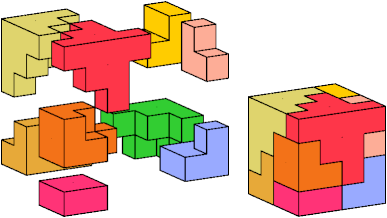Put the pieces together to form a cube with a hole inside. The solution is unique.