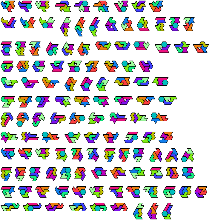 This page shows all 131 ways to arrange the 12 hexiamonds to form three congruent polyiamonds. The problem was suggested by Andris Cibulis.