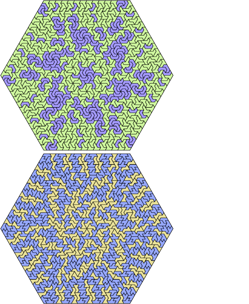 Here I show the smallest known badges that can be tiled by copies of two heptiamonds, using at least one of each. If you find a smaller solution, please write.