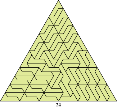 Go here for a tiling of a triangle with side 35. It has ternary symmetry except in the center. I found it in 2024.