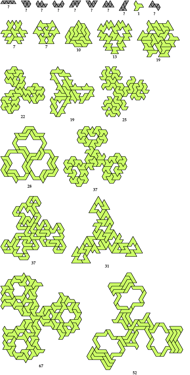 Here are the minimal known tri-oddities for heptiamonds (7-iamonds).