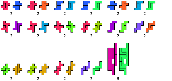 For compatibility figures with an odd number of tiles, see Livio Zucca's Pentomino Odd Pairs. For Galvagni compatibility (self-compatibility), see Galvagni Figures & Reid Figures for Pentominoes.