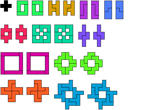 Most of the pentomino Galvagni and Reid figures were found by Erich Friedman of Stetson University and Michael Reid of the University of Central Florida. Corey Plover found the minimal Galvagni figure for the T pentomino.