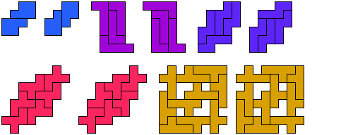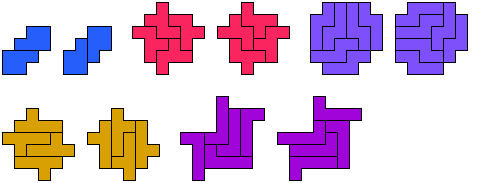 Here are diagonally symmetric variants for the F, L, N, P, and Y pentominoes:
