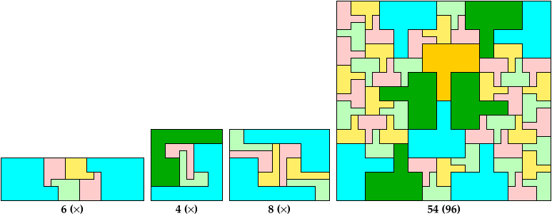 Scaled polyominoes for which no known rectangle tiling is known do not appear below. If you find such a tiling, or find a solution with fewer tiles than the solution shown below, please write.