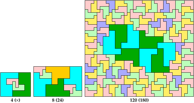 For all other minimal scaled tilings, the number of tiles in the minimal non-scaled rectangle tiling appears in parentheses after the number of tiles in the minimal scaled tiling.