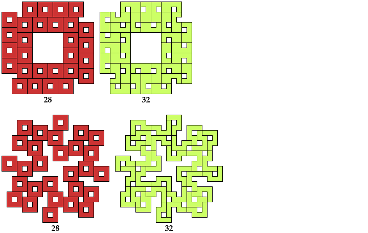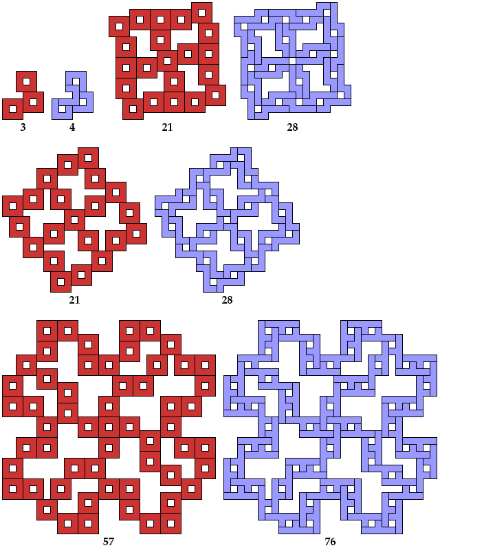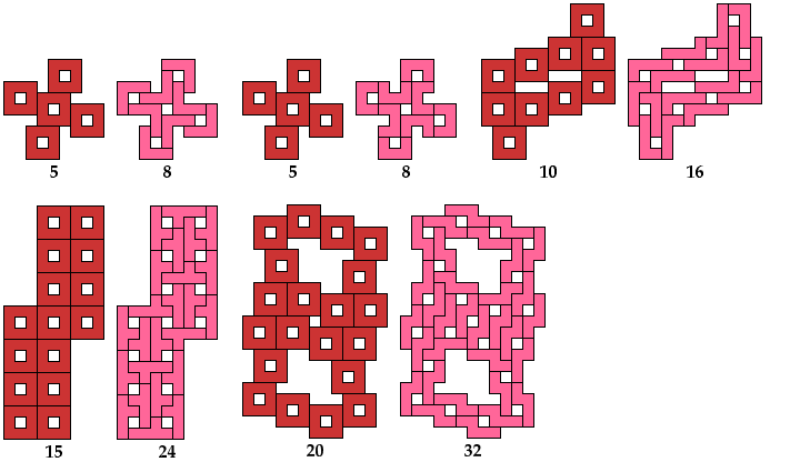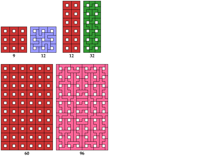 All but one of the solutions for trominoes, tetrominoes, and pentominoes were found by Giovanni Resta and can be seen at his monumental website Polypolyominoes.