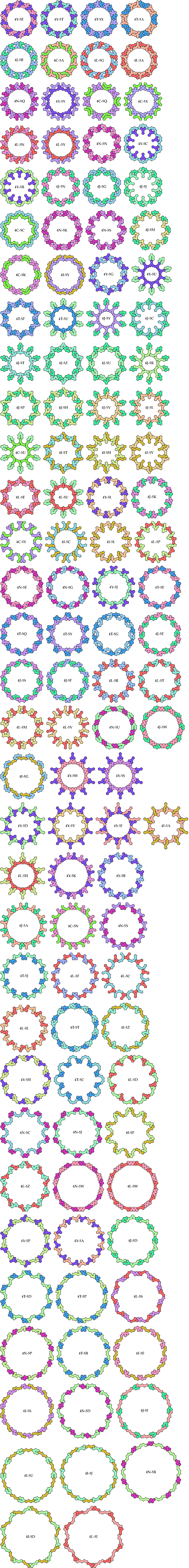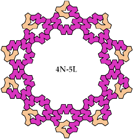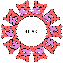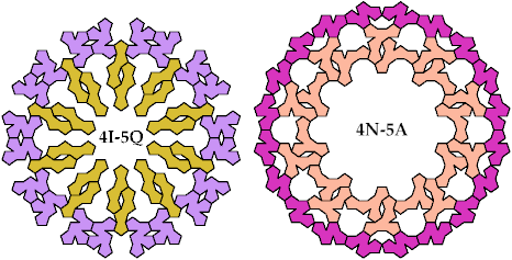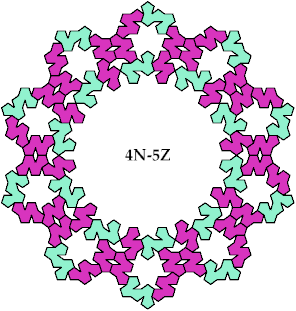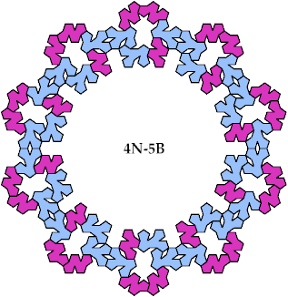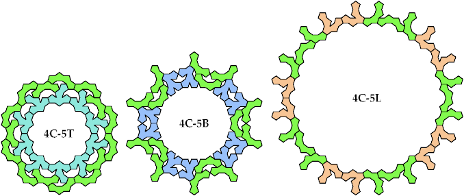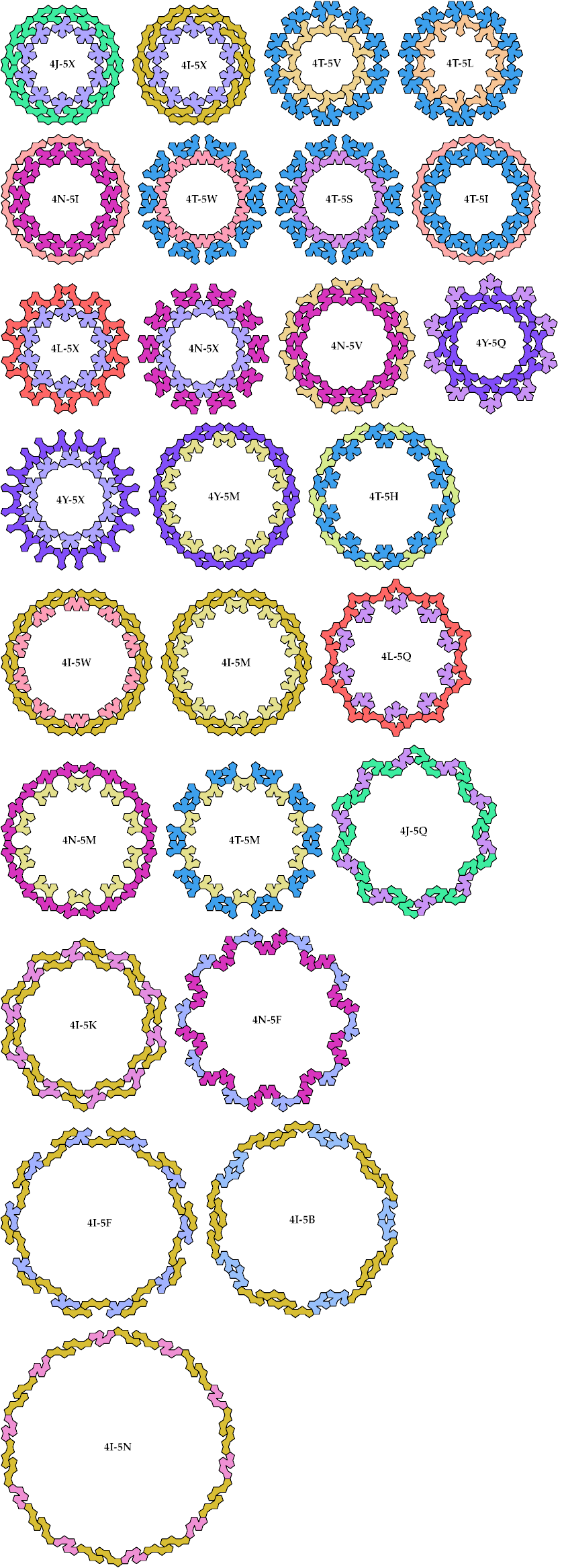 A Baiocchi figure is a figure formed by joining copies of a polyform and having the maximal symmetry for the polyform's class. For polypents, that means the symmetry of a regular decagon, or 10-way rotary with reflection.