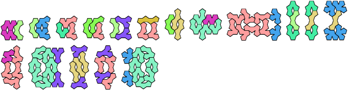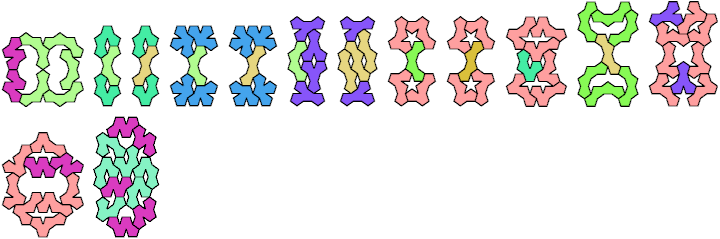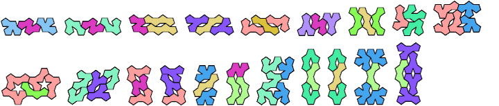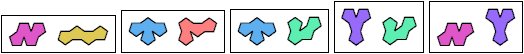 Oddities can also be constructed from two different shapes. Here are the minimal known oddities for pairs of tetrapents, using at least one copy of each tetrapent. Please write if you find a smaller solution or solve an unsolved case.